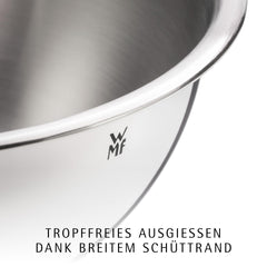Schüssel ist nicht gleich Schüssel. Daher bietet WMF eine Vielzahl von Küchenschüsseln – für verschiedene Zutaten und unterschiedliche Zubereitungsmethoden. So eignen sich beispielsweise Schüsseln mit Griff und stabilem Standring zum Aufschlagen von Sahne oder Eiern. Die großen, bauchigen Küchenschüsseln hingegen sind ideal fürs Rühren. Für die Zubereitung mit einem Stabmixer dienen hohe Schüsseln mit Griff. Darüber hinaus bietet WMF Schüsseln mit einem Schüttrand, der ein leichtes Ausgießen ermöglicht, ohne dass etwas danebentropft. Die WMF Küchenschüsseln sind aus Cromargan Edelstahl Rostfrei 18/10 gefertigt, einem Material, das äußerst formstabil ist und im Gebrauch – beispielsweise mit einem Rührgerät – unverwüstlich bleibt. Sämtliche Schüsseln sind leicht zu reinigen, spülmaschinenbeständig und damit sehr hygienisch. Ob als Salatschüssel, Rührschüssel, Servierschüssel oder Wasserbadschüssel - die Schüsseln aus diesem Edelstahl Schüssel Set sind multifunktional verwendbar, robust und stilvoll.
